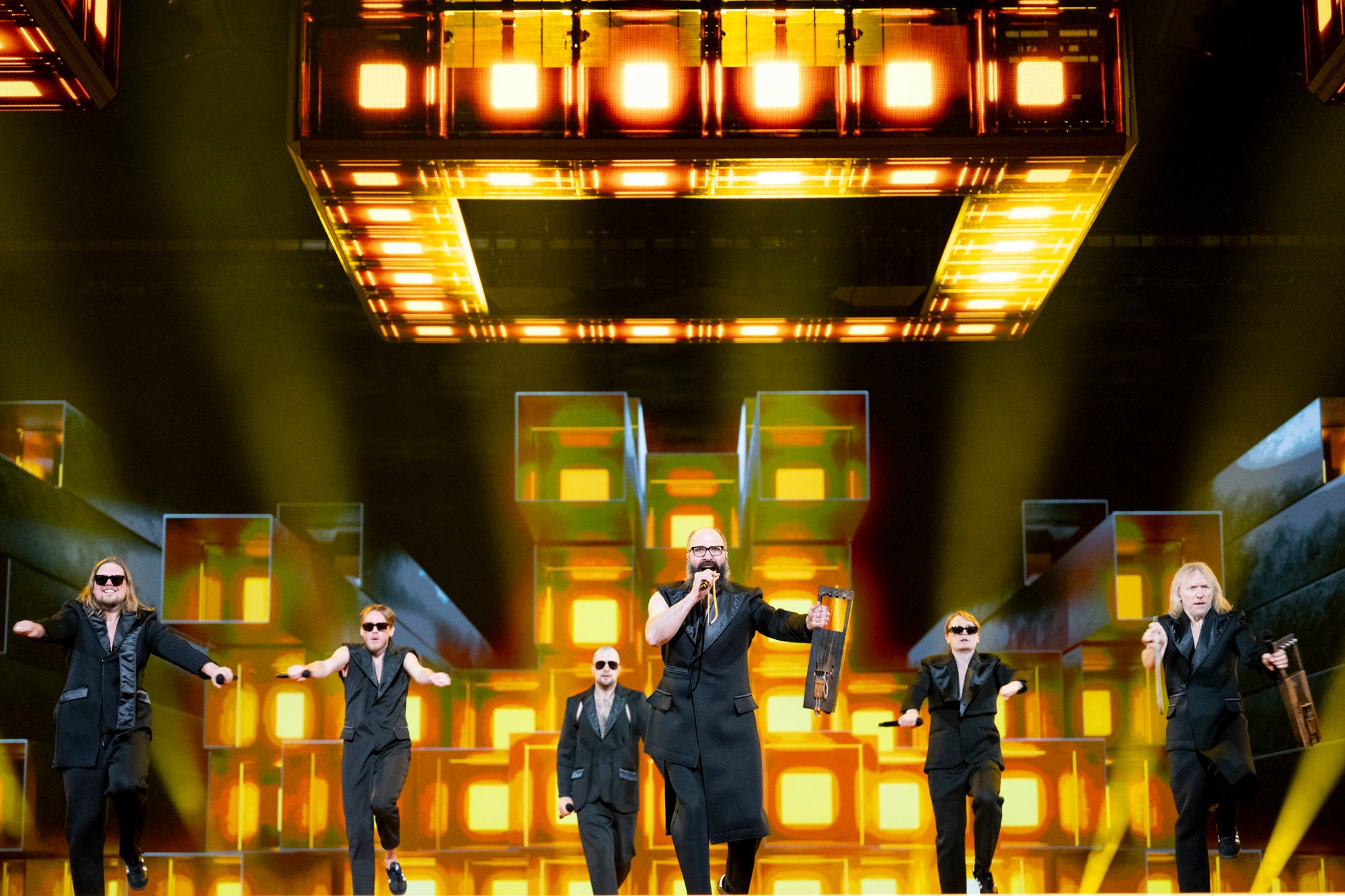 According to the Eurovision live-blog, the band retain some elements of their Eesti Laul performance, as the bands dress up in their iconic black suits. Puuluup walk around the stage playing their well-known talharpas, whilst 5MIINUST continue to ramp up the energy with audience participation. The LED cubes are brought down for much of the performance, made up of smaller cubes that change colour during the course of the song. This is also included in the LED screen at the back of the stage.